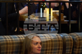 Mezzo-soprano singer Daria Klimenko, centre in red, performs as peopl enjoy an evening at "Pushkarev" street side cafe in Moscow, Russia, Wednesday, Oct. 22, 2025. (AP Photo/Alexander Zemlianichenko)