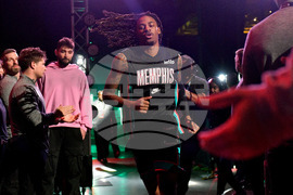 Memphis Grizzlies guard Ja Morant runs onto the court before an NBA basketball game against the New Orleans Pelicans, Wednesday, Oct. 22, 2025, in Memphis, Tenn. (AP Photo/Brandon Dill)