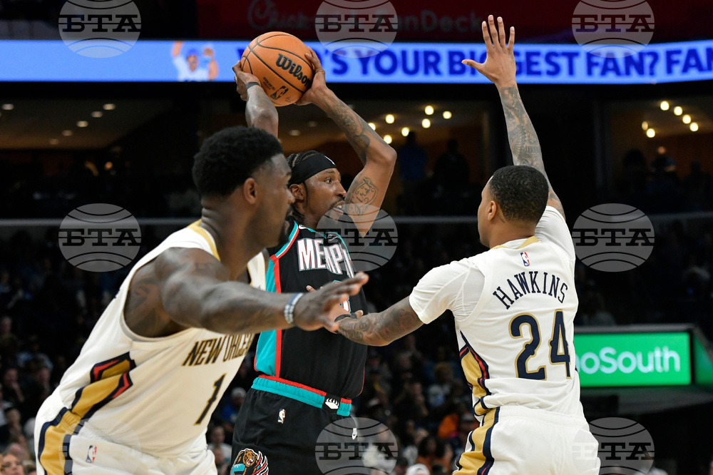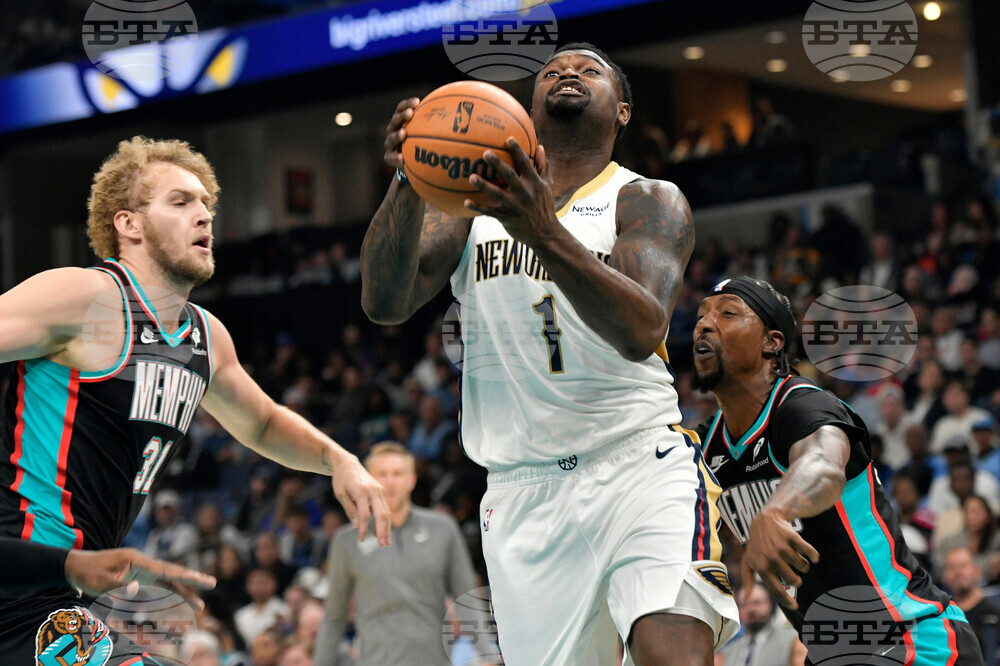 New Orleans Pelicans forward Zion Williamson (1) drives to the basket between Memphis Grizzlies center Jock Landale (31) and guard Kentavious Caldwell-Pope in the first half of an NBA basketball game Wednesday, Oct. 22, 2025, in Memphis, Tenn. (AP Photo/Brandon Dill)