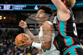 Memphis Grizzlies forward Santi Aldama (7) drives ahead of New Orleans Pelicans guard Saddiq Bey (41) in the second half of an NBA basketball game Wednesday, Oct. 22, 2025, in Memphis, Tenn. (AP Photo/Brandon Dill)