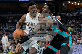 Memphis Grizzlies guard Ja Morant drives against New Orleans Pelicans forward Herbert Jones (2) in the second half of an NBA basketball game Wednesday, Oct. 22, 2025, in Memphis, Tenn. (AP Photo/Brandon Dill)