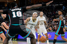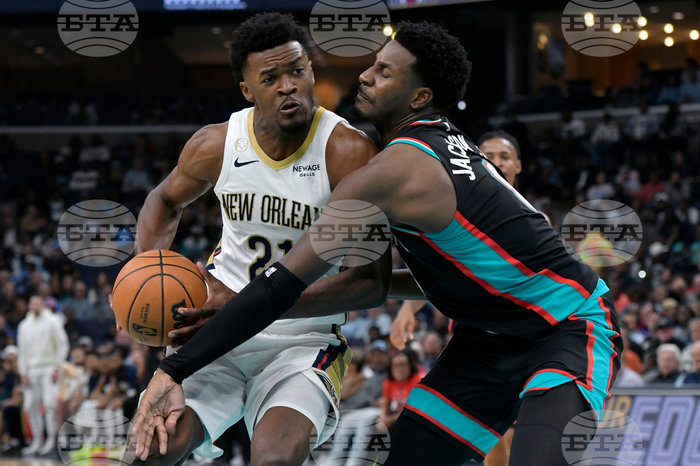 New Orleans Pelicans forward Herb Jones, center right, handles the ball against Memphis Grizzlies guard Ja Morant (12) in the first half of an NBA basketball game Wednesday, Oct. 22, 2025, in Memphis, Tenn. (AP Photo/Brandon Dill)