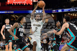 New Orleans Pelicans forward Herb Jones (2) shoots against Memphis Grizzlies guard Ja Morant (12) in the first half of an NBA basketball game Wednesday, Oct. 22, 2025, in Memphis, Tenn. (AP Photo/Brandon Dill)