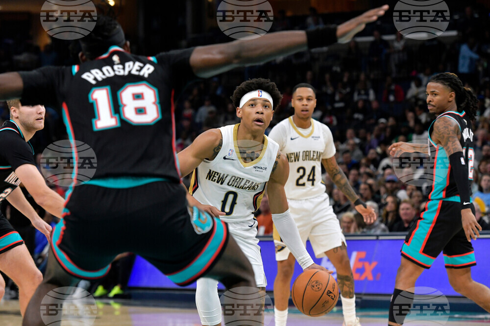 New Orleans Pelicans guard Jeremiah Fears (0) handles the ball between Memphis Grizzlies forward Olivier-Maxence Prosper (18) and center Jock Landale in the first half of an NBA basketball game Wednesday, Oct. 22, 2025, in Memphis, Tenn. (AP Photo/Brandon Dill)