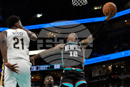Memphis Grizzlies guard Ja Morant (12) shoots against New Orleans Pelicans center Yves Missi (21) in the second half of an NBA basketball game Wednesday, Oct. 22, 2025, in Memphis, Tenn. (AP Photo/Brandon Dill)