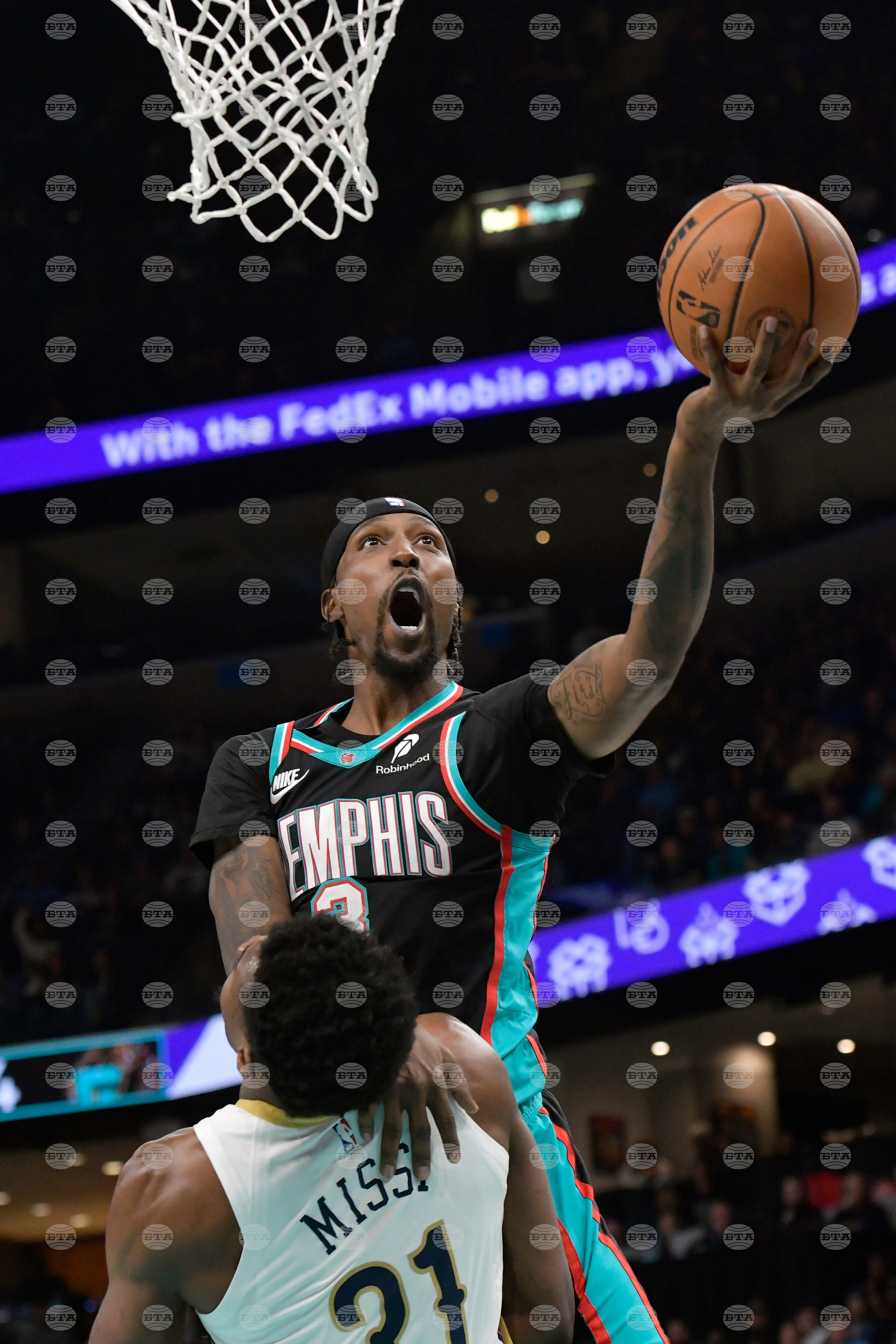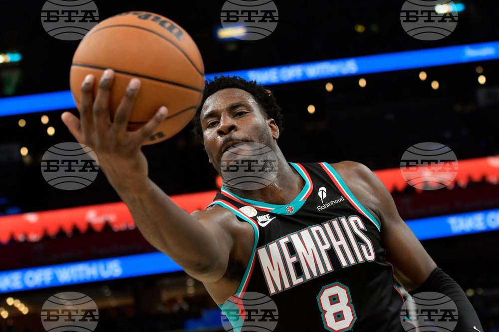 Memphis Grizzlies forward Jaren Jackson Jr. (8) grabs the ball in the second half of an NBA basketball game against the New Orleans Pelicans Wednesday, Oct. 22, 2025, in Memphis, Tenn. (AP Photo/Brandon Dill)