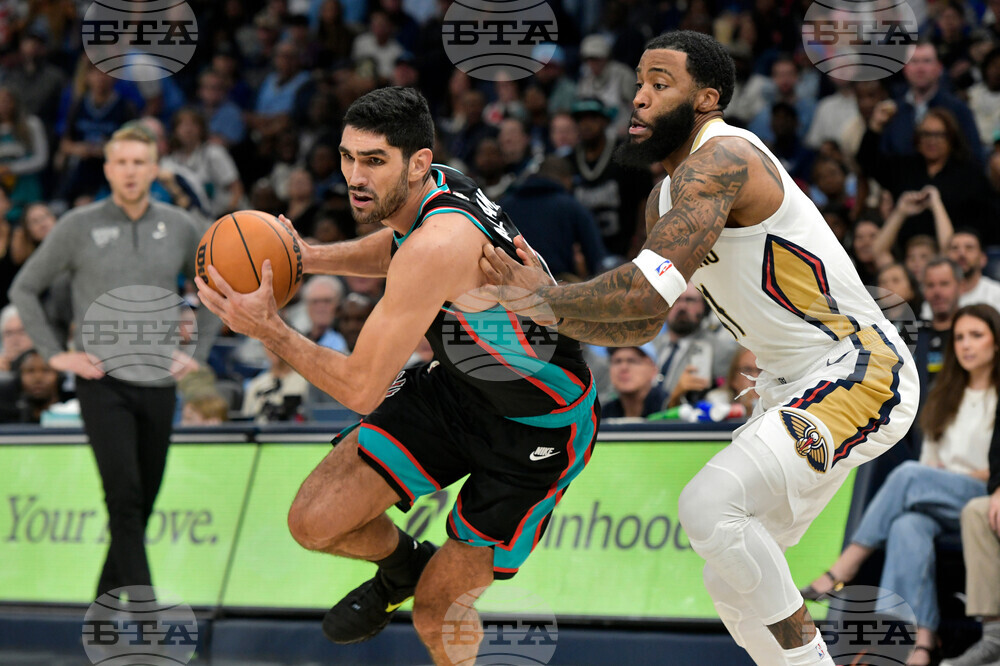 Memphis Grizzlies forward Santi Aldama, left, handles the ball against New Orleans Pelicans guard Saddiq Bey (41) in the second half of an NBA basketball game Wednesday, Oct. 22, 2025, in Memphis, Tenn. (AP Photo/Brandon Dill)