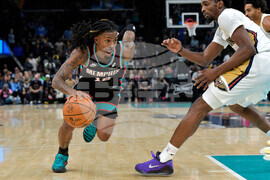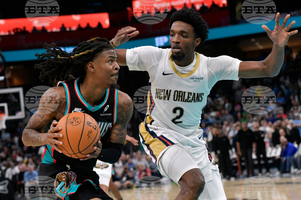 Memphis Grizzlies guard Ja Morant (12) handles the ball against New Orleans Pelicans forward Herbert Jones in the second half of an NBA basketball game Wednesday, Oct. 22, 2025, in Memphis, Tenn. (AP Photo/Brandon Dill)