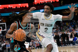 New Orleans Pelicans guard Jeremiah Fears (0) handles the ball against Memphis Grizzlies forward Olivier-Maxence Prosper (18) in the first half of an NBA basketball game Wednesday, Oct. 22, 2025, in Memphis, Tenn. (AP Photo/Brandon Dill)