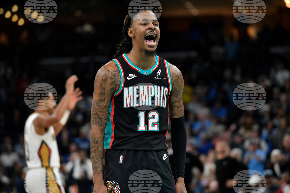 Memphis Grizzlies guard Ja Morant (12) reacts in the first half of an NBA basketball game against the New Orleans Pelicans, Wednesday, Oct. 22, 2025, in Memphis, Tenn. (AP Photo/Brandon Dill)