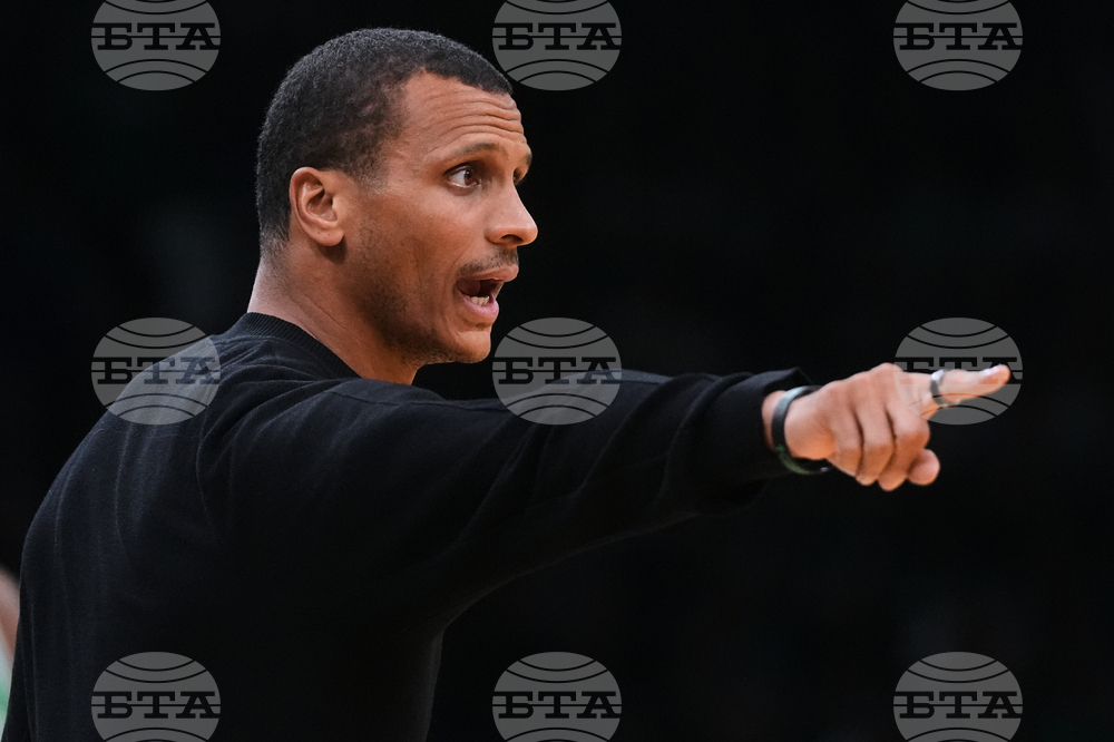 Boston Celtics head coach Joe Mazzulla calls to his players during the first half of an NBA basketball game, Wednesday, Oct. 22, 2025, in Boston. (AP Photo/Charles Krupa)