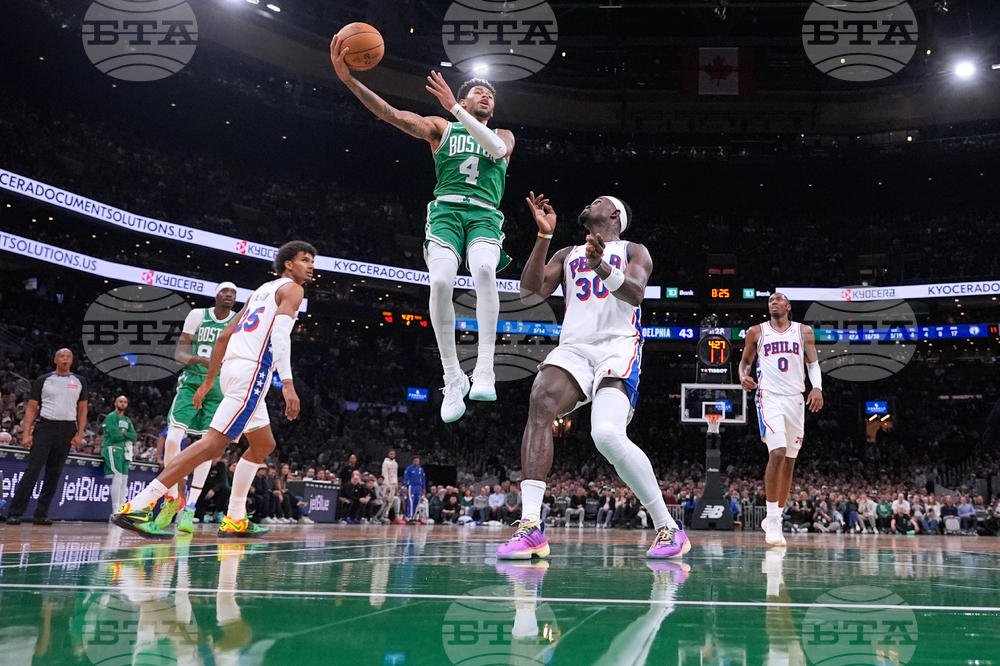 Boston Celtics guard Anfernee Simons (4) drives to the basket against the Philadelphia 76ers during the first half of an NBA basketball game, Wednesday, Oct. 22, 2025, in Boston. (AP Photo/Charles Krupa)
