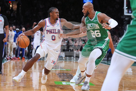 Philadelphia 76ers guard Tyrese Maxey (0) drives to the basket against Boston Celtics forward Xavier Tillman (26) during the second half of an NBA basketball game, Wednesday, Oct. 22, 2025, in Boston. (AP Photo/Charles Krupa)