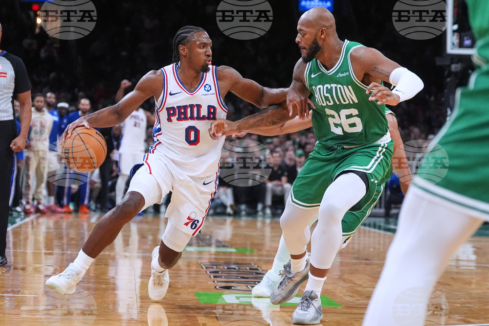 Philadelphia 76ers guard Tyrese Maxey (0) and guard VJ Edgecombe (77) pressure Boston Celtics guard Payton Pritchard (11), who was making a failed attempt at the game-winning basket, during the final seconds of the second half of an NBA basketball game, Wednesday, Oct. 22, 2025, in Boston. (AP Photo/Charles Krupa)