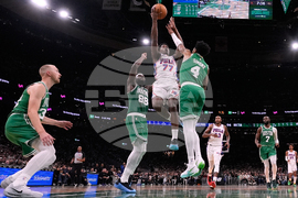 Philadelphia 76ers forward Dominick Barlow, left, battles for a rebound against Boston Celtics guard Derrick White (9) during the first half of an NBA basketball game, Wednesday, Oct. 22, 2025, in Boston. (AP Photo/Charles Krupa)
