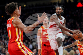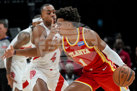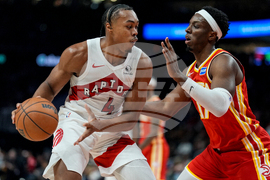Toronto Raptors guard Ochai Agbaji (30) moves on Atlanta Hawks forward Jalen Johnson (1) during the first half of an NBA basketball game, Wednesday, Oct. 22, 2025, in Atlanta. (AP Photo/Mike Stewart)