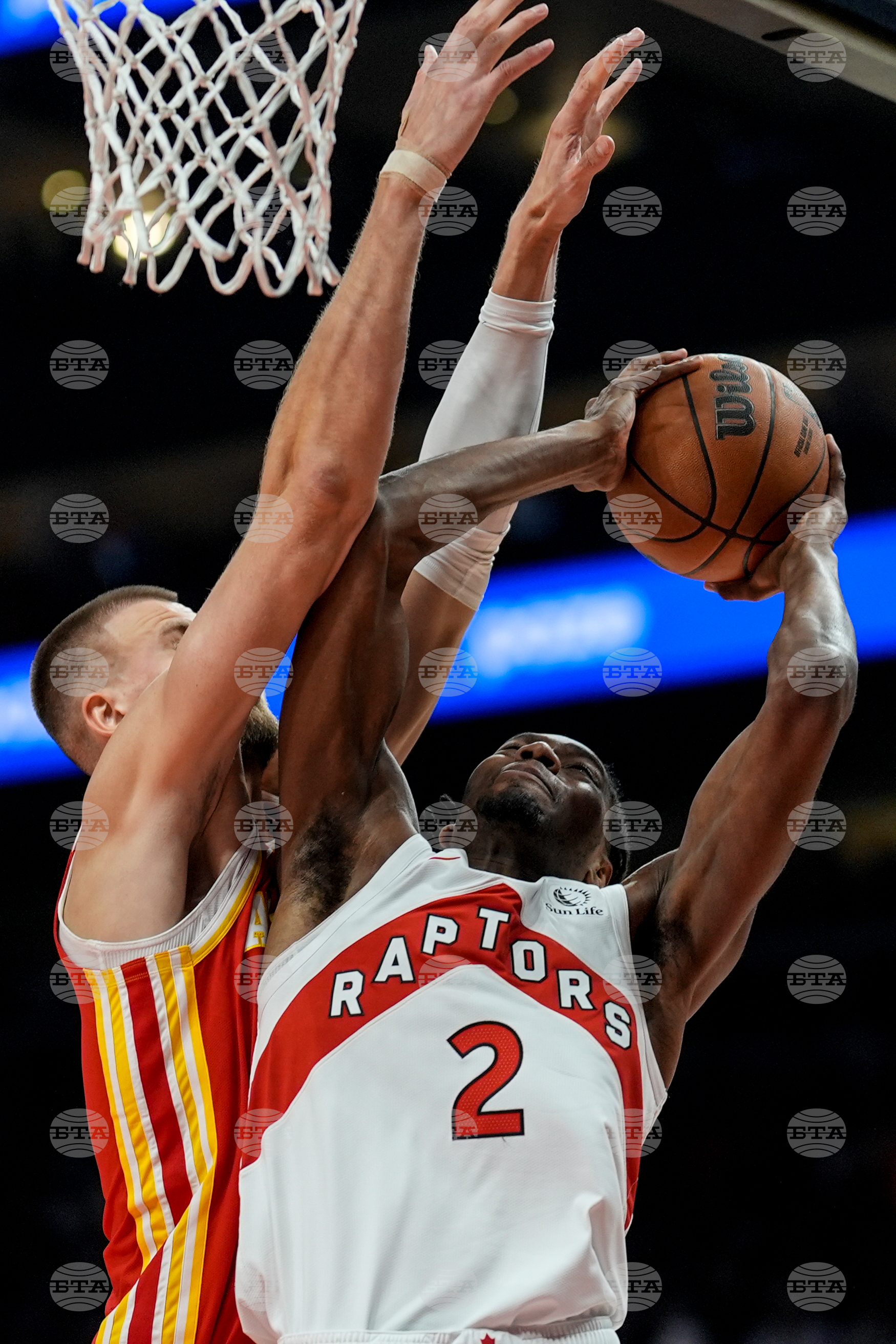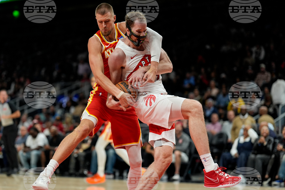 Atlanta Hawks center Kristaps Porzingis (8) stops Toronto Raptors forward Jonathan Mogbo (2) during the first half of an NBA basketball game, Wednesday, Oct. 22, 2025, in Atlanta. (AP Photo/Mike Stewart)