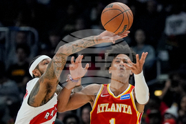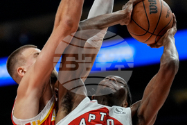 Atlanta Hawks forward Jalen Johnson (1) shoots against Toronto Raptors center Jakob Poeltl (19) during the second half of an NBA basketball game, Wednesday, Oct. 22, 2025, in Atlanta. (AP Photo/Mike Stewart)