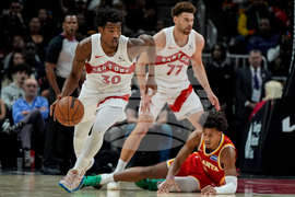 Toronto Raptors forward Brandon Ingram (3) and Atlanta Hawks forward Jalen Johnson (1) vie for a loose ball during the first half of an NBA basketball game, Wednesday, Oct. 22, 2025, in Atlanta. (AP Photo/Mike Stewart)