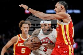 Toronto Raptors forward Scottie Barnes (4) goes to the basket against Atlanta Hawks guard Dyson Daniels (5) during the first half of an NBA basketball game, Wednesday, Oct. 22, 2025, in Atlanta. (AP Photo/Mike Stewart)
