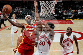 Toronto Raptors forward Brandon Ingram (3) drives against Atlanta Hawks during the first half of an NBA basketball game, Wednesday, Oct. 22, 2025, in Atlanta. (AP Photo/Mike Stewart)