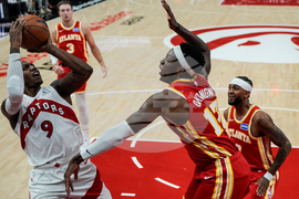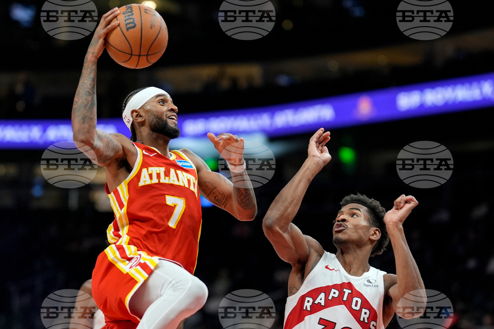 Toronto Raptors forward RJ Barrett (9) shoots against Atlanta Hawks forward Onyeka Okongwu (17) during the first half of an NBA basketball game, Wednesday, Oct. 22, 2025, in Atlanta. (AP Photo/Mike Stewart)