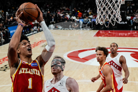 Atlanta Hawks forward Jalen Johnson (1) drives against Toronto Raptors forward Scottie Barnes (4) during the first half of an NBA basketball game, Wednesday, Oct. 22, 2025, in Atlanta. (AP Photo/Mike Stewart)