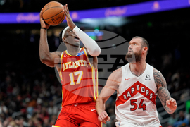 Atlanta Hawks forward Onyeka Okongwu (17) shoots against Toronto Raptors forward Sandro Mamukelashvili (54) during the second half of an NBA basketball game, Wednesday, Oct. 22, 2025, in Atlanta. (AP Photo/Mike Stewart)