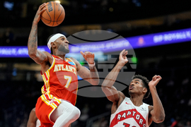 Atlanta Hawks guard Nickeil Alexander-Walker (7) shoots against Toronto Raptors guard Ochai Agbaji (30) during the second half of an NBA basketball game, Wednesday, Oct. 22, 2025, in Atlanta. (AP Photo/Mike Stewart)
