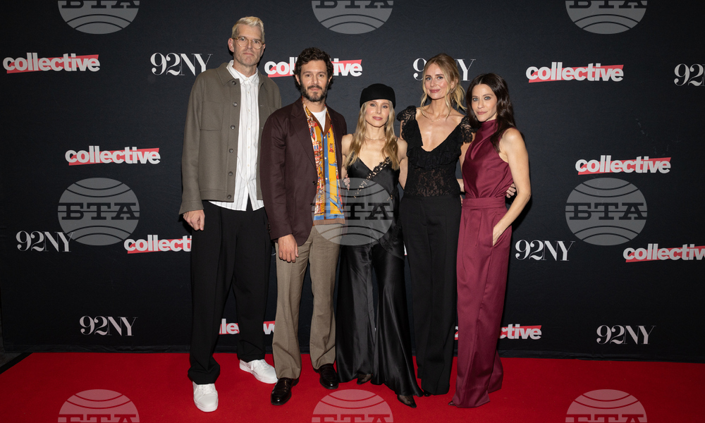 Timothy Simons, from left, Adam Brody, Kristen Bell, Justine Lupe, and Jackie Tohn from the cast of the Netflix television series "Nobody Wants This" pose backstage at The 92nd Street Y on Wednesday, Oct. 22, 2025, in New York. (Photo by CJ Rivera/Invision/AP)