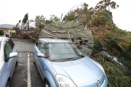 Cars are damaged by a fallen tree that fell during strong winds in Invercargill, New Zealand, Wednesday, Oct. 22, 2025. (Robyn Edie/Southland Times/STUFF via AP)