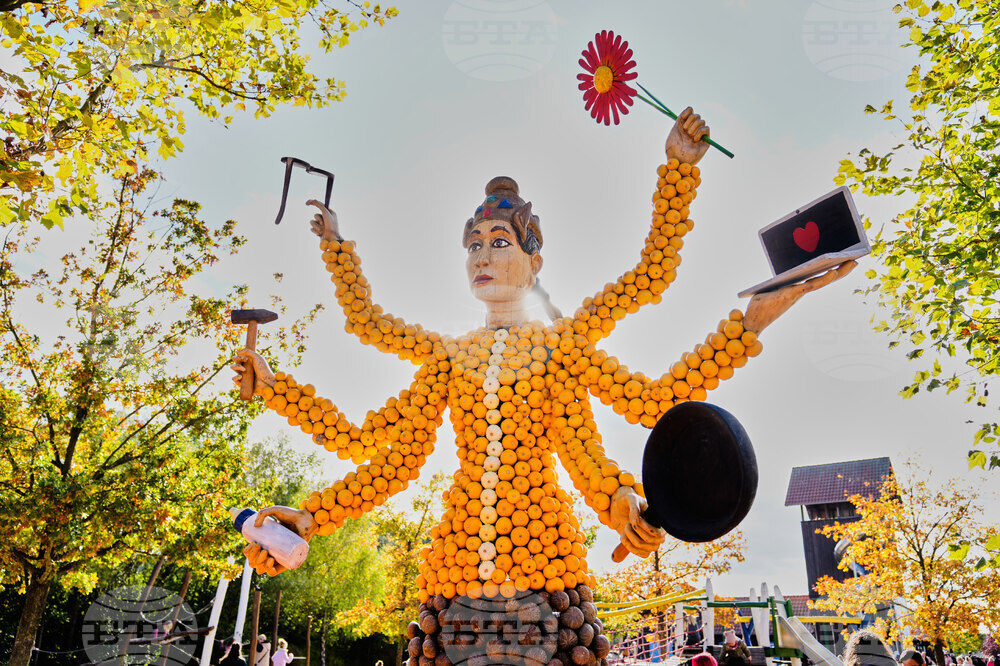 A pumpkin sculpture depicting a goddess with six arms, is displayed at Klaistow farm’s annual pumpkin festival, which this year celebrates “powerful women,” in Beelitz near Berlin, Germany, Tuesday, Oct. 21, 2025. (AP Photo/Markus Schreiber)