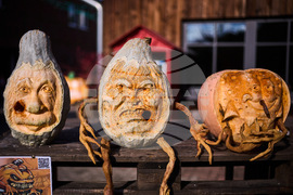 Carved gourds are displayed at Klaistow farm’s annual pumpkin festival, which this year celebrates “powerful women,” in Beelitz near Berlin, Germany, Tuesday, Oct. 21, 2025. (AP Photo/Markus Schreiber)