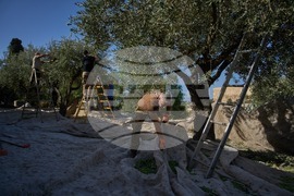Italian volunteers work on the olive harvest at the Franciscan hermitage on the Mount of Olives in Jerusalem, Friday, Oct. 3, 2025. (AP Photo/Oded Balilty)