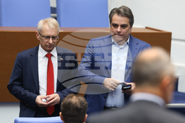 София (23 октомври 2025) Парламентът провежда редовно заседание в сградата Народното събрание. На снимката (от ляво надясно): народните представители от ПП-ДБ Николай Денков и Асен Василев.