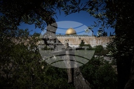 A cross hangs from an olive tree in the Franciscan hermitage on the Mount of Olives with the Dome of the Rock shrine at the Al-Aqsa Mosque compound in the background, in Jerusalem, Friday, Oct. 3, 2025. (AP Photo/Oded Balilty)