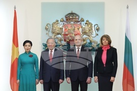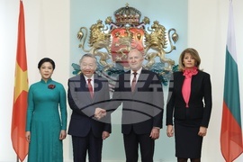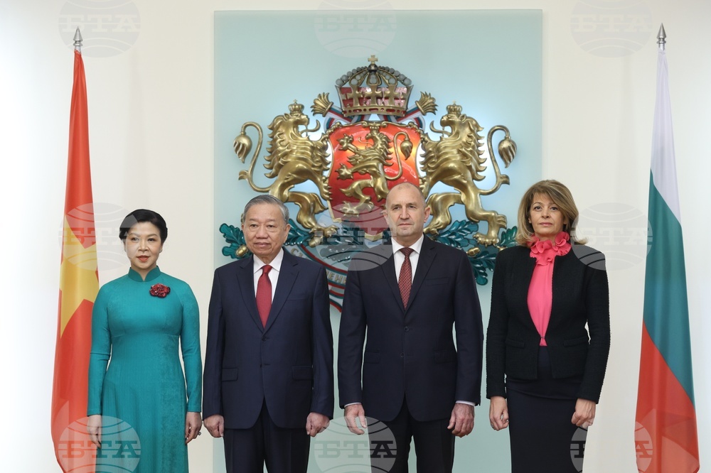 София (23 октомври 2025) Генералният секретар на Виетнамската комунистическата партия То Лам e на посещение в България по покана на президента Румен Радев. На „Дондуков“ 2 двамата провеждат съвместна среща. На снимката (от ляво надясно): съпругата на виетнамския президент Нго Фъонг Ли, президентът То Лам, президентът Румен Радев, съпругата на българския президент Десислава Радева.