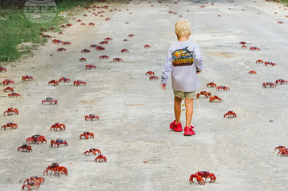 In this image supplied by Parks Australia, a young boy walks amongst red crabs during their annual migration, Oct. 19, 2025 on Christmas Island, Australia. (Parks Australia via AP)