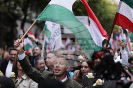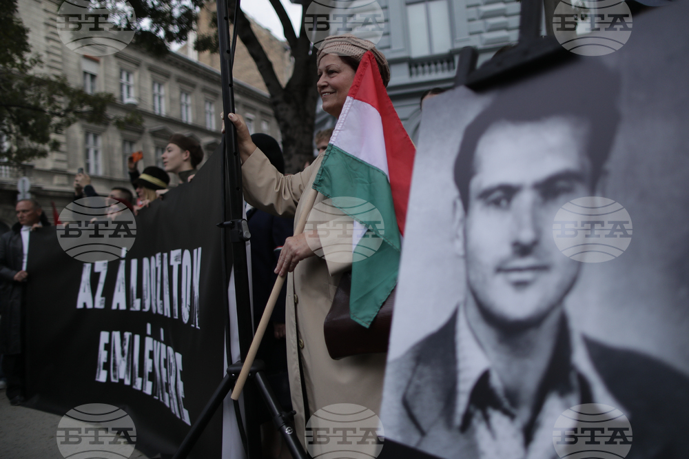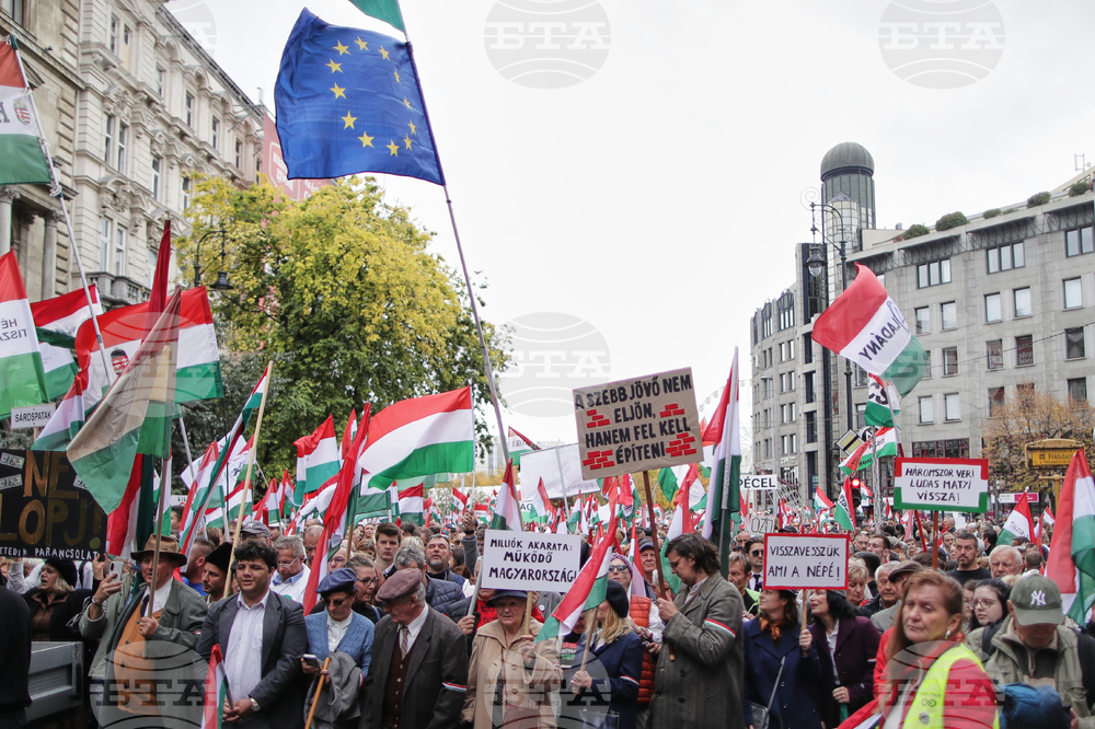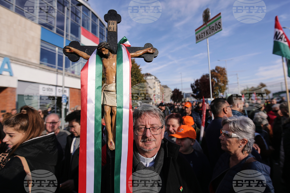 Demonstrators they take part in a rally organized by the opposition TISZA party during celebrations marking the 69th anniversary of the outbreak of Hungary's 1956 revolution against communist rule and the Soviet Union, in Budapest, Hungary, Thursday, Oct. 23, 2025. (AP Photo/Rudolf Karancsi)