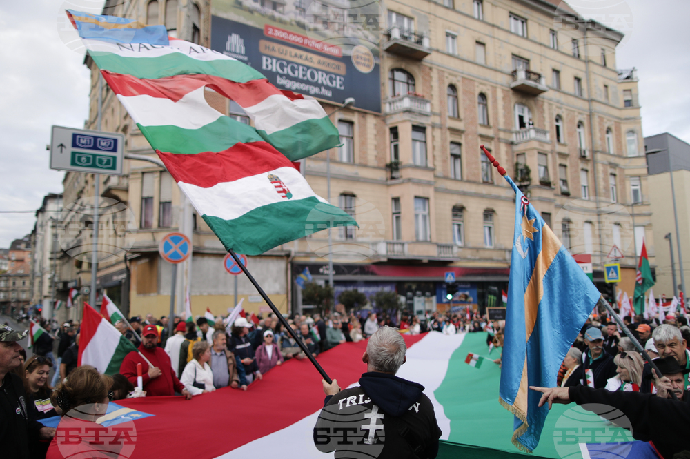 Pro-government demonstrators march during celebrations marking the 69th anniversary of the outbreak of Hungary's 1956 revolution against communist rule and the Soviet Union, in Budapest, Hungary, Thursday, Oct. 23, 2025. (AP Photo/Rudolf Karancsi)