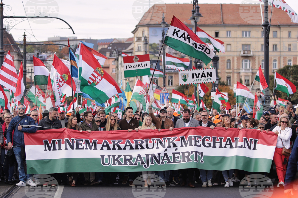 Pro-government demonstrators hold a banner reading "We don't want to die for Ukraine!" in Hungarian during celebrations marking the 69th anniversary of the outbreak of Hungary's 1956 revolution against communist rule and the Soviet Union, in Budapest, Hungary, Thursday, Oct. 23, 2025. (AP Photo/Rudolf Karancsi)