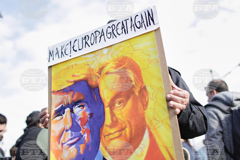 A pro-government demonstrator holds a sign with drawings of U.S. President Donald Trump and Hungarian Prime Minister Viktor Orban during celebrations marking the 69th anniversary of the outbreak of Hungary's 1956 revolution against communist rule and the Soviet Union, in Budapest, Hungary, Thursday, Oct. 23, 2025. (AP Photo/Rudolf Karancsi)