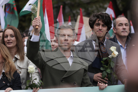 The leader of the Hungarian opposition TISZA party, Peter Magyar, foreground and center, rallies during a demonstration marking the 69th anniversary of the outbreak of Hungary's 1956 revolution against communist rule and the Soviet Union, in Budapest, Hungary, Thursday, Oct. 23, 2025. (AP Photo/Rudolf Karancsi)