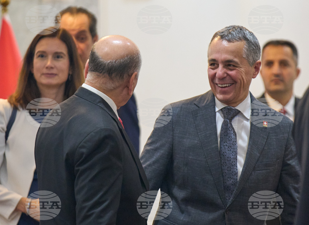 Swiss federal Councillor and Foreign Minister Ignazio Cassis, left, and Iraqi Foreign Minister Fuad Hussein talk during their meeting in Baghdad, Iraq, Thursday, Oct. 23, 2025 (Anthony Anex/Keystone via AP)