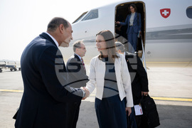 Maja Riniker, President of the National Council of Switzerland, centre, is welcomed by the Charge d'Affaires ad interim of the Republic of Iraq in Bern, Muhammad Jawad al-Quraishi, left, in Baghdad, Iraq, Thursday, Oct. 23, 2025. (Anthony Anex/Keystone via AP)