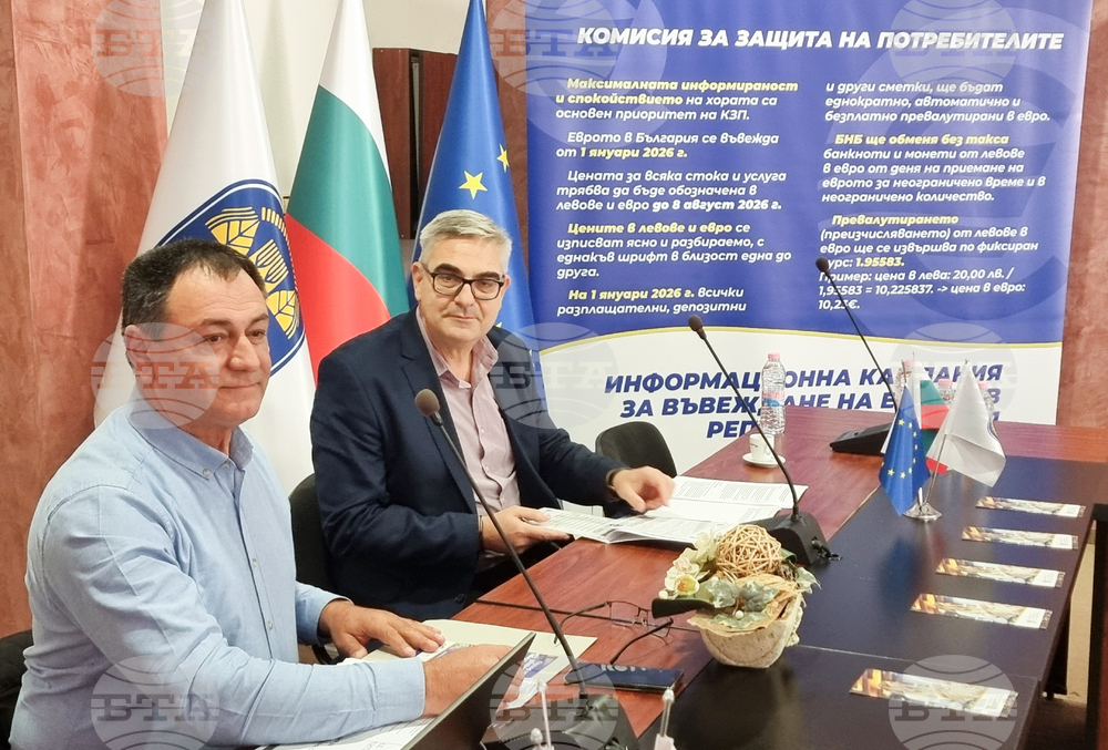 Село Стамболово (23 октомври 2025) Информационна среща, посветена на въвеждането на еврото у нас, се състоя в залата на Общинския съвет в Стамболово. Целта на кампанията е гражданите да получат ясна, подробна и достоверна информация за основните етапи и срокове от процеса по въвеждане на еврото. На снимката: главният инспектор в Комисията за защита на потребителите (КЗП) Васил Донев (вляво) и директорът на офиса на Националната агенция за приходите в Хасково Любомир Делчев (вдясно).