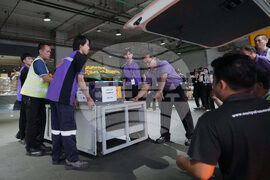 Workers carry a coffin containing the body of Sonthaya Oakkharasri, a Thai laborer who was taken hostage by Hamas as it arrives at Suvarnabhumi International Airport in Samut Prakarn, Thailand, Thursday, Oct. 23, 2025. (AP Photo/Sakchai Lalit)