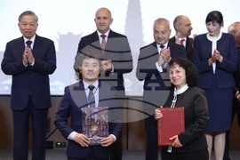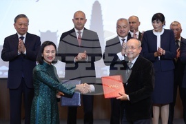 София (23 октомври 2025) Изпълнителната агенция за насърчаване на малките и средни предприятия (ИАНМСП) и Агенцията за чуждестранни инвестиции на Виетнам (FIA) организират днес бизнес форум "Възможности за бизнес сътрудничество между Република България и СР Виетнам". Церемония по размяна на Меморандум за разбирателство. На снимката: началникът на отдел "Международно сътрудничество" към Софииски университет "Св. Климент Охридски" Ирена Атанасова и деканът на Училище за информационни и комуникационним технологии към Ханойски университет за наука и технологии Та Хай Тунг.
