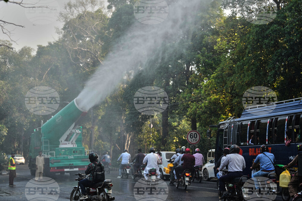 Workers of Environment Protection Agency spray water with anti-smog guns at a road in Lahore, Pakistan, Thursday, Oct. 23, 2025. (AP Photo/K.M. Chaudary)