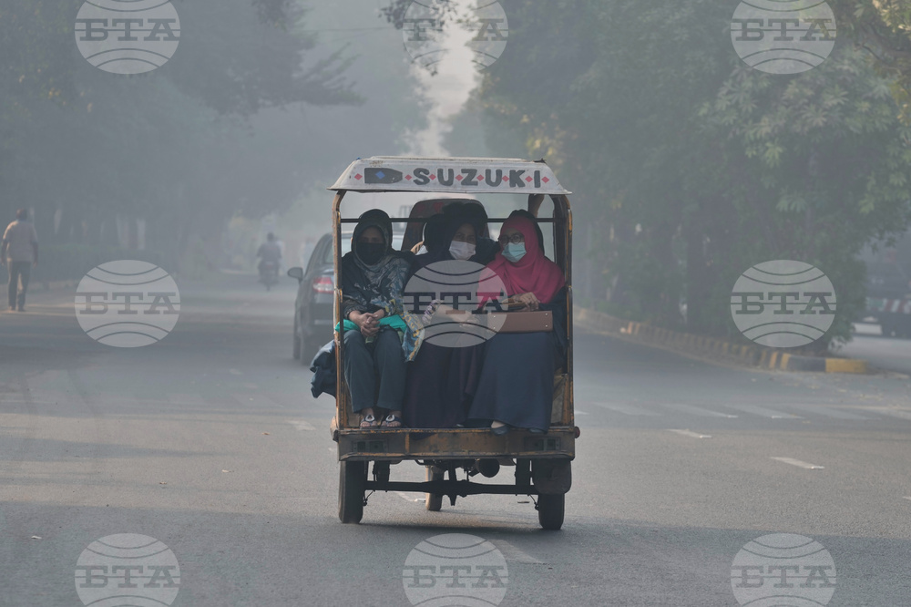 Women travel on a trip-wheeler auto rickshaw on a road as smog envelops the areas of Lahore, Pakistan, Friday, Oct. 24, 2025. (AP Photo/K.M. Chaudary)